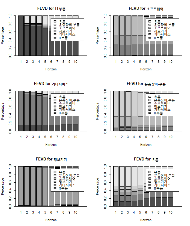그렇다면 각 변수들마다 어떤 산업에 주로 영향을 많이 받는가? 이를 확인하기 위해 분산분해를 시행해보았다. 분산분해란 각 변수들의 충격반응함수의 영향력들을 전체분산에서 그 비중을 확인할 수 있도록 해주는 것이다.